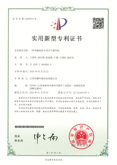 一种顶驱钻机专用空气调节机 专利证书